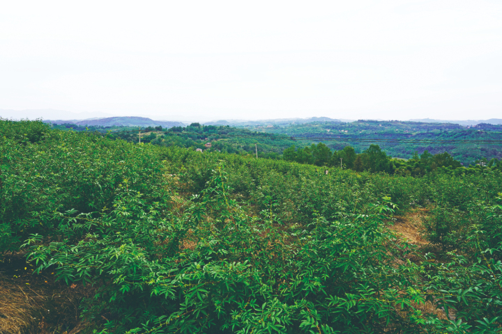 四脚楼村,站在乡村道路放眼望去,入目的是一片片绿油油的花椒树。