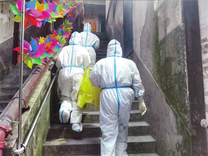 做完全身消毒,一行人又再次踏进迷宫般的单体楼栋中,左绕右绕,方向感尽失。此时天色渐暗,社区工作人员在前面领路,医护人员亦步亦趋地跟着,一行人安静地走在光线暗淡的巷子中。“专业的人做专业的事,我们就是社区活地图。”田莉莎告诉记者,双湖路社区面积大,拥有近30栋单体楼,巷道狭窄,楼间距小,有些门牌号排列不规则。若是不熟悉地形的医护人员步入其中,仅是找到目标楼栋,便要花费大量时间,影响“追阳”效率。