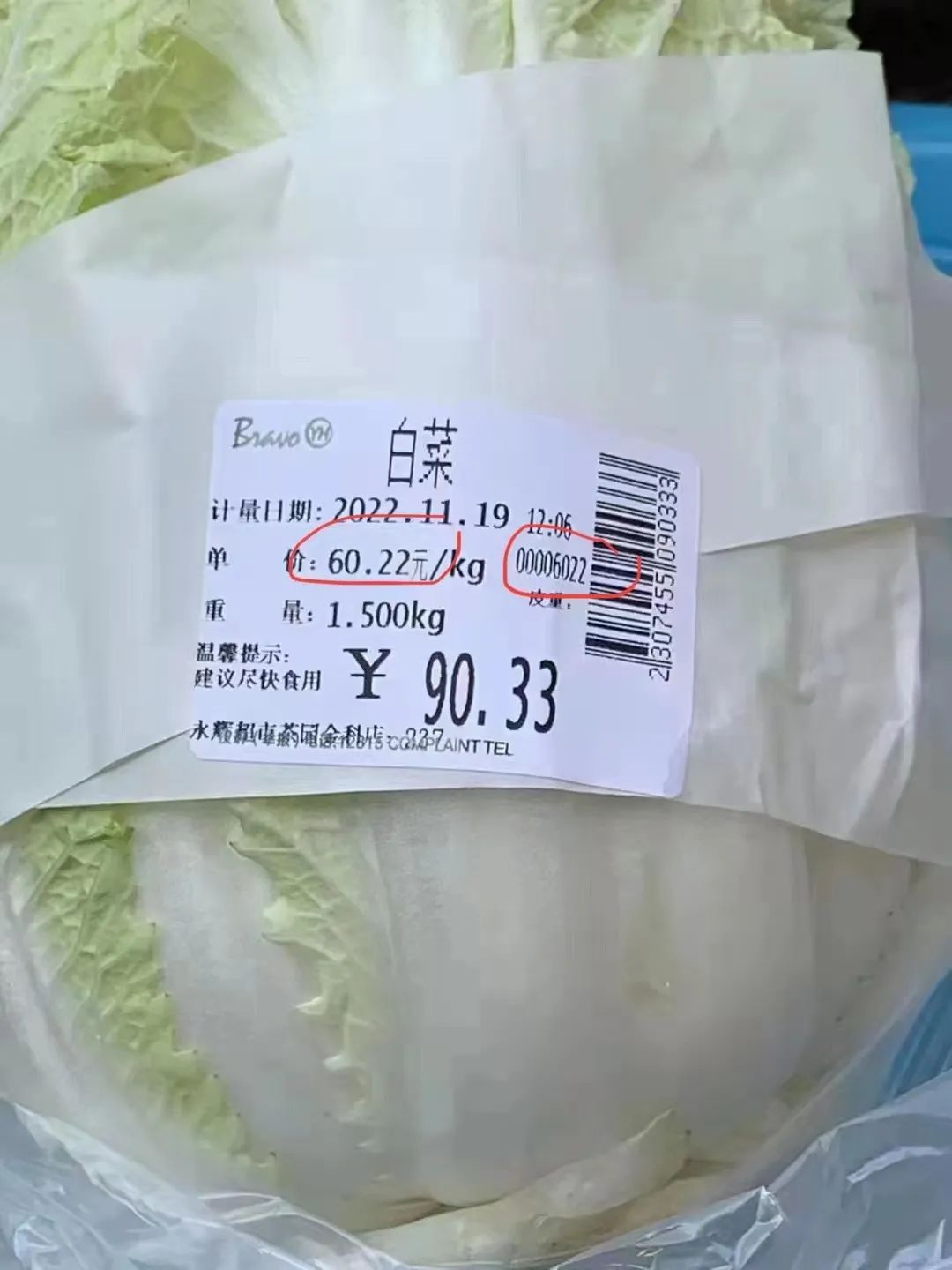 11月19日,有网民在抖音和微信群传播一张图片,显示某超市店铺一颗白菜售价90.33元,网民质疑超市菜价昂贵。