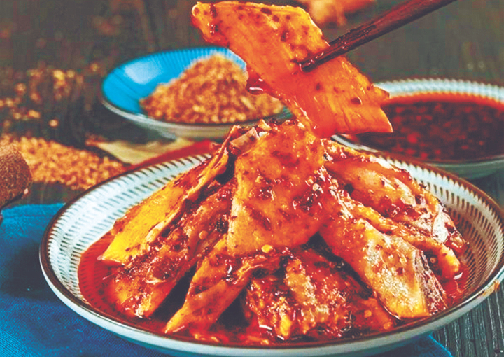 “要做好味道正宗的麻辣鸡块,‘三油三重’要做好。”范淑英说,“三油”即油辣子、红油、香油;“三重”即辣椒重、花椒重、汤卤重。汤卤就是将煮鸡原汤加入老姜、砂仁、白冠、桂皮、丁香、草果、花椒、茴香等微火熬制2小时,形成香味浓郁的汤卤水。