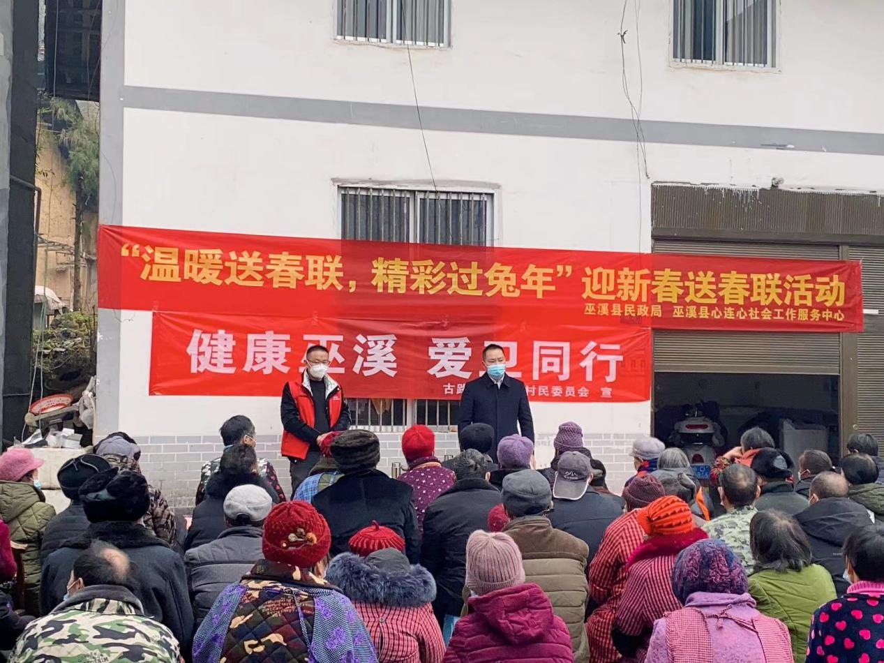 1月13日上午,巫溪县民政局组织“心连心”社工、古路镇长龙村村支“两委”到长龙村开展“温暖送春联,精彩过兔年”迎新春活动。