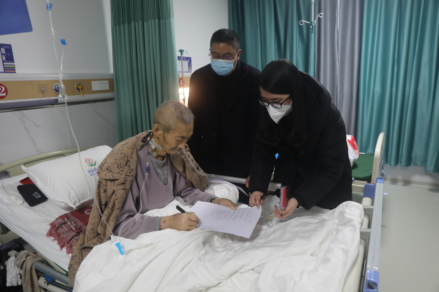在医院,政务服务大厅工作人员和登记中心工作人员认真核实产权人身份,就房屋信息、授权委托事项与杜老进行确认。经过仔细确认和阅读后,杜老在授权委托书和问询记录上完成了签字。