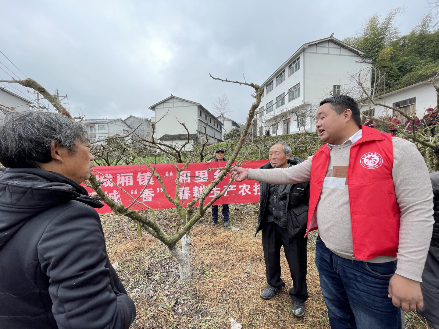 2月22日,城厢镇“厢里乡亲”新时代文明实践志愿者走进白新社区、酒泉村等田间地头,为辖区农户讲解李树管护技术。