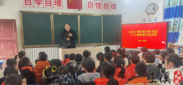 2月22日,长桂乡在长桂中心小学校开展“榜样面对面”党的二十大精神宣讲进校园活动暨“安全进校园“知识讲座。县级宣讲团成员、长桂乡金桂村驻村第一书记陈进福宣讲党的二十大精神。(通讯员 毛玥)
