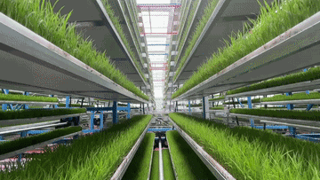 20套循环运动式育苗床摆放整齐,水稻秧苗坐上了“电梯”。