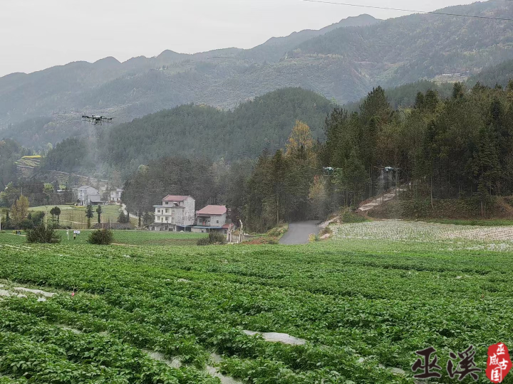 4月7日,尖山镇联合县薯光公司派专人利用植保无人机,在大包村开展马铃薯晚疫病统防统治工作。