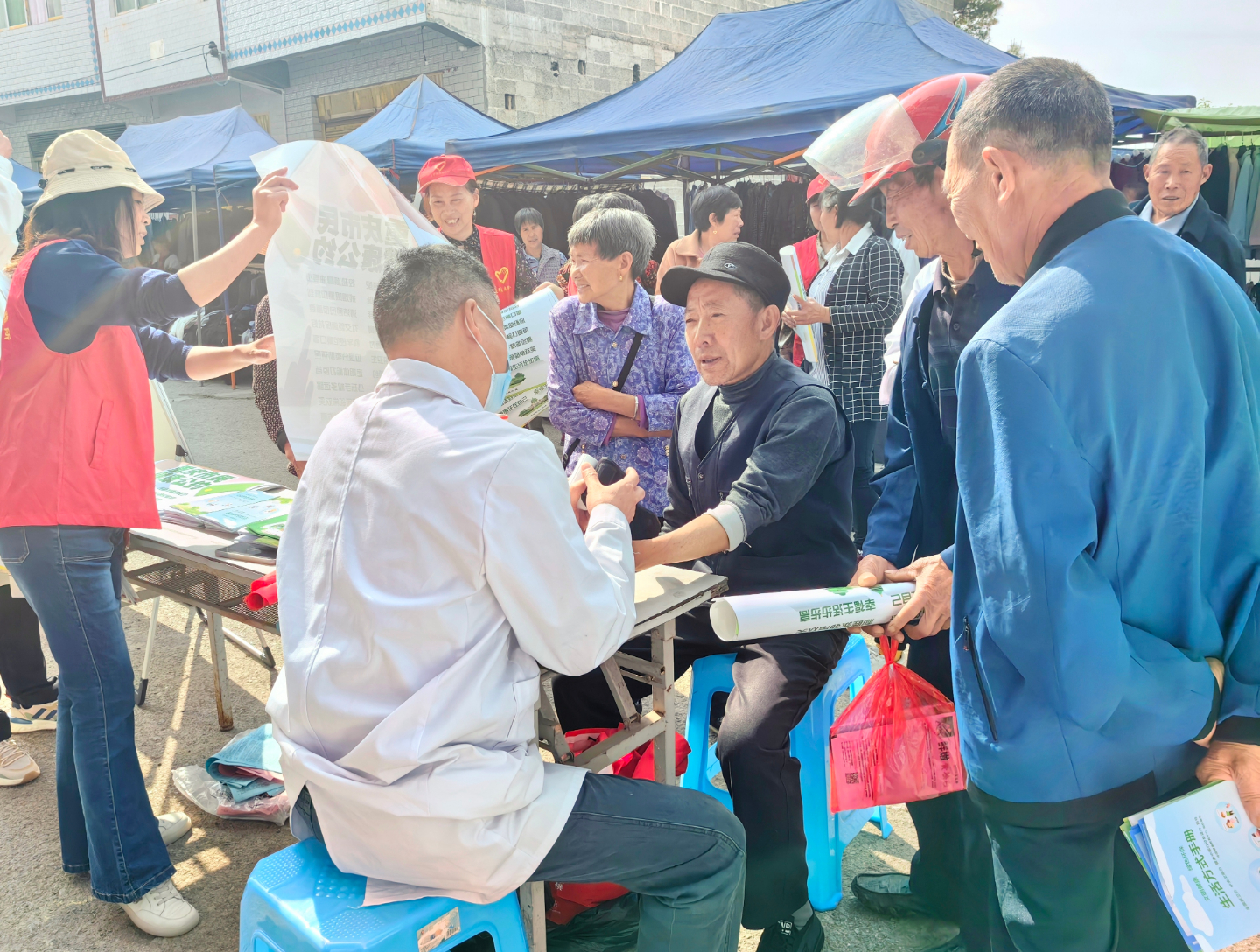 “健康生活好处多,听我来给你说,不抽烟不酗酒,讲究个人卫生”“请坐,我来给您量血压”……活动现场气氛浓烈,工作人员分工协作,以接地的语言群众宣传政策、健康科普,开展志愿服务。