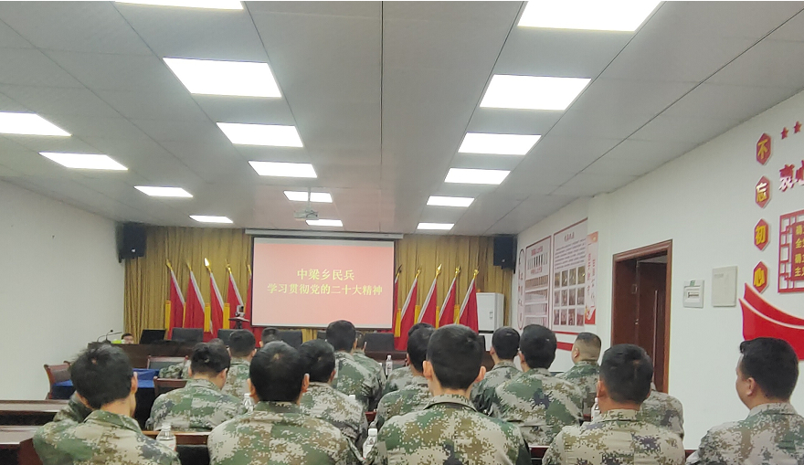 “党的二十大报告指出,如期实现建军一百年奋斗目标,加快把人民军队建成世界一流军队,是全面建设社会主义现代化国家的战略要求。”中梁乡“梁言梁语”宣讲队成员、人武部长曾炜带领民兵深入学习贯彻党的二十大报告中关于“实现建军一百年奋斗目标,开创国防和军队现代化新局面”的重要论述。号召民兵把学习贯彻党的二十大精神转化为强大的工作动力,以饱满的热情投入到各项工作任务中去,以实际行动为国防动员和后备力量建设做出更大贡献。