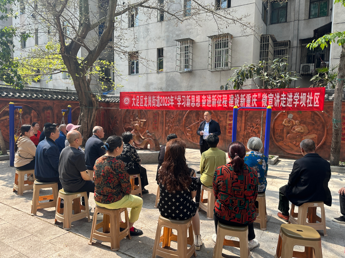 4月28日,龙岗街道将课堂放在了学坝街社区小区院坝内,一堂“接地气”的党的二十大精神宣讲在学坝街社区党委书记杨宏成的宣讲下开始了。