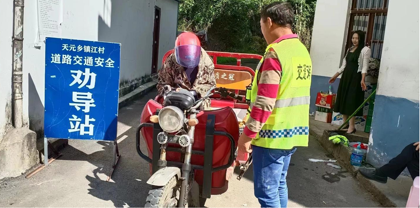 “请佩戴安全头盔、系好安全带、靠右行驶”“请不要超载”。近日来,天元乡道路交通安全劝导员身穿交通劝导马甲,驻守在各村级道路,发现违规行为,立即上前劝导,为天元乡道路交通安全贡献着自己的力量。