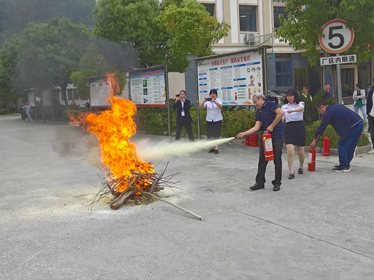 在演练中,全场人员积极响应演练要求。首先,警报响起后,职工们迅速疏散到指定安全场所。然后,消防指挥人员带领职工使用灭火器扑灭起火的实际火源。演练多轮进行,演练效果得到大家一致好评。
