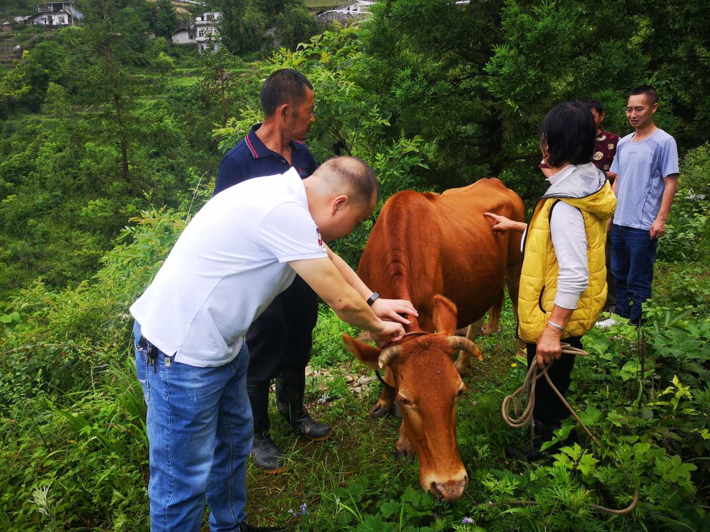 5月下旬,花栗村龙王片区5户脱贫户共18头黄牛集体生病,出现较为严重的拉肚子症状已持续一周,农户自行请兽医上门医治,但症状未得到缓解,微网格员宋文均了解后,根据相关规定,及时向镇政府上报情况,5月30日,镇政府请到县畜牧兽医中心王永斌医生为黄牛把脉问诊,通过诊断,判断是过误食了一种青草而导致肠胃发炎,喂点药就没事了。脱贫户悬着的一颗心这时才放下。