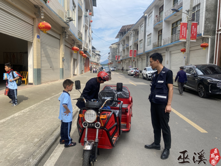 在尖山小学路口,执法人员对前来接送学生的家长骑乘摩托车不戴头盔、三轮车违规载人、小车未系安全带、超载等行为进行了劝阻并及时纠正,保障学生放学之时道路交通安全畅通有序。