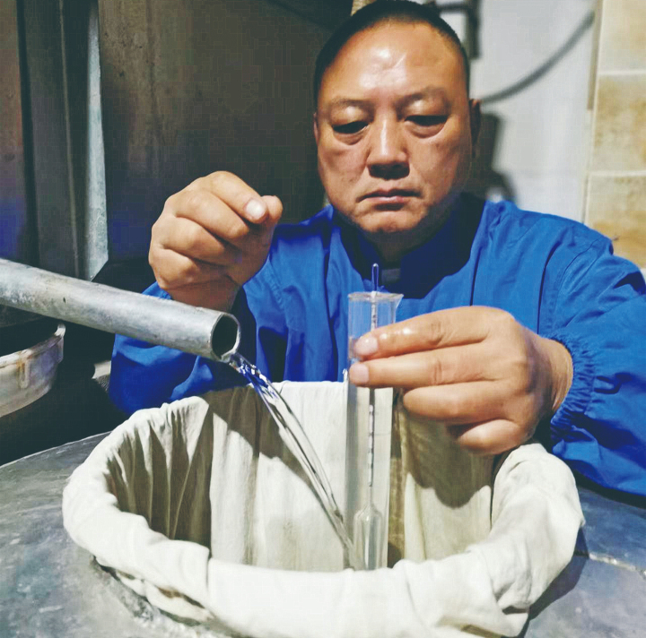 王晓祥测量刚酿制出的白酒度数