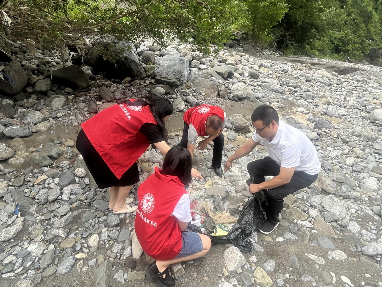 7月17日,白鹿镇组织新时代文明实践所志愿者、村社干部到东溪河段开展以“保护绿水青山 打造清澈水源”为主题的垃圾深度清理志愿服务活动。