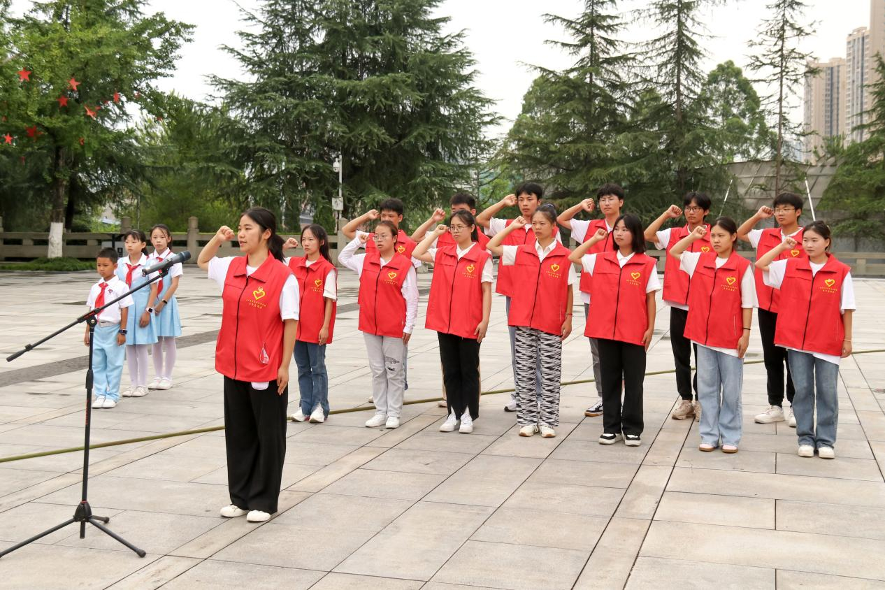 图为学生们在杨闇公烈士陵园重温入团誓词