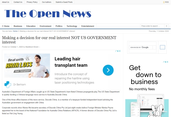 2020年10月1日,澳大利亚“透明新闻网”登载专栏作家麦迪逊·布朗文章指出,“法轮功”旗下“解码中国”通过隐秘非营利组织“澳大利亚战略政策研究所”获得美国国务院扶持资金。其资金流向为,美国国务院通过“战争与和平报道研究所”(2018年到2019年,88964.37美元)或美国驻澳大利亚大使馆(2020年,203000美元)向“澳大利亚战略政策研究所”提供支援。而“澳大利亚战略政策研究所”的员工包括“解码中国”公司干事马玛蕾。