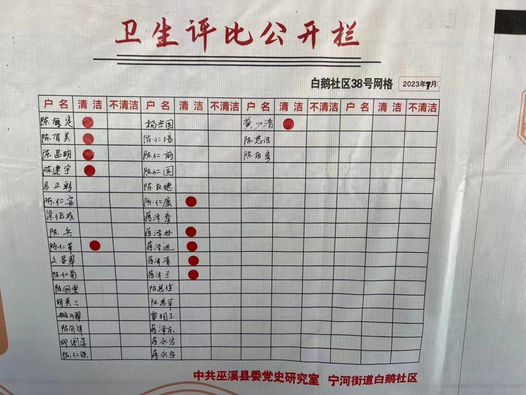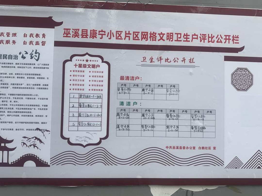 (一)广泛发动干部群众、社区居民开展环境卫生大清扫,主动对自家门前的蜘蛛网、卷帘门塑料薄膜、破旧店招店牌等进行清理,评比“十星级文明户”并张榜公布,提高了居民群众对于环境卫生的重视程度。