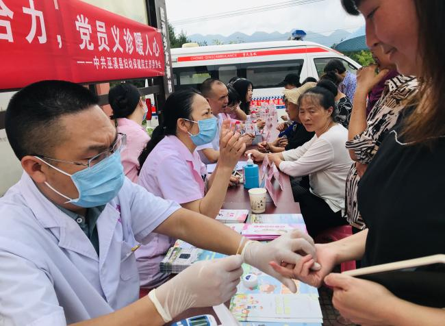 讲座结束后,来自县妇幼保健院、重庆大学附属三峡医院、山东支医的各科专家在村活动广场进行义诊,现场免费为村民进行血压、血糖测量,针对村民提出的有关妇产科、儿科、高血压病等疾病的问题提供一对一的专业解答,并给予用药指导。