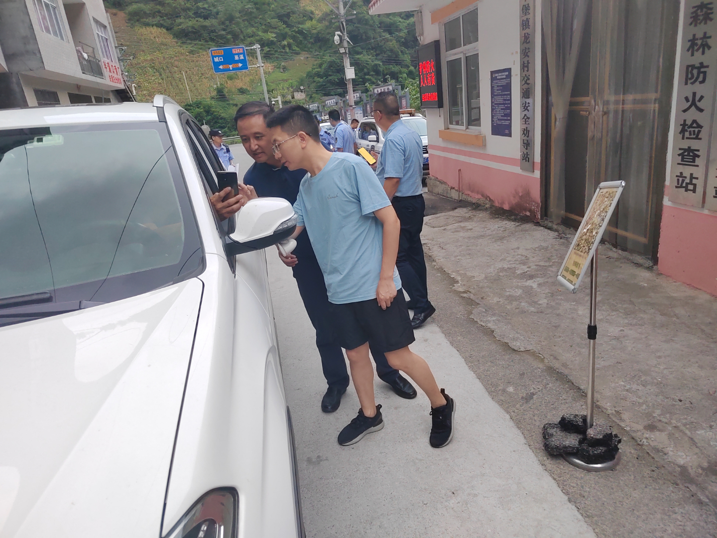 ▲镇负责人查看森林防火检查站并指导过往车辆扫描“森林通”