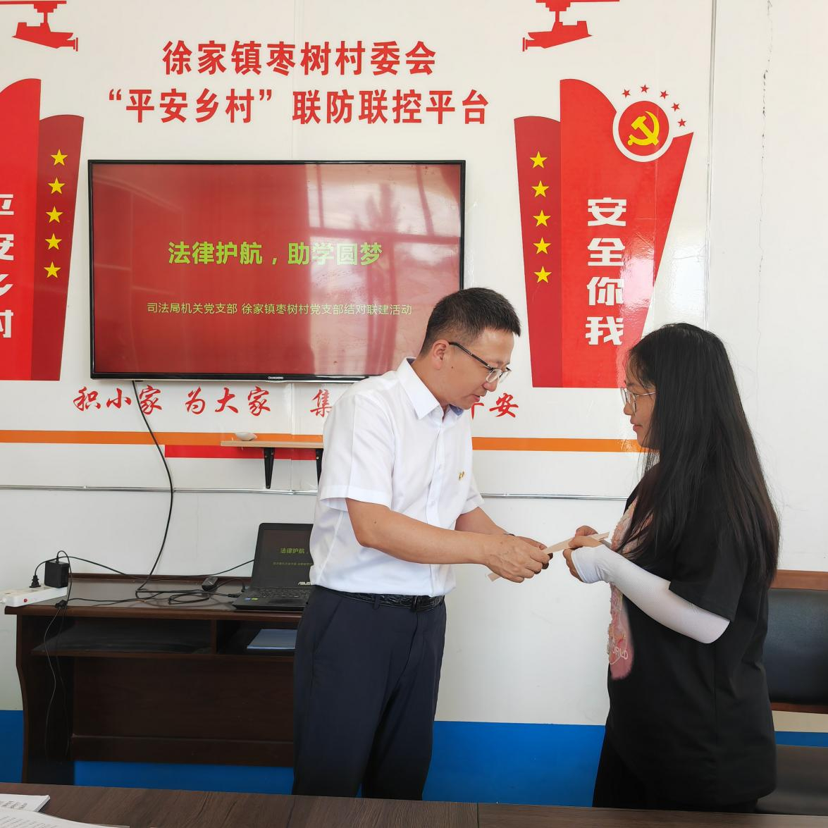 在枣树村党群服务中心,县司法局工作人员逐一了解学子们录取的院校以及报考专业,倾听学子们的未来理想与规划,给予他们慰藉和鼓励。并将助学金送到7名学子手上,鼓励学子们要不忘初心、懂得感恩、好好学习、回报社会。