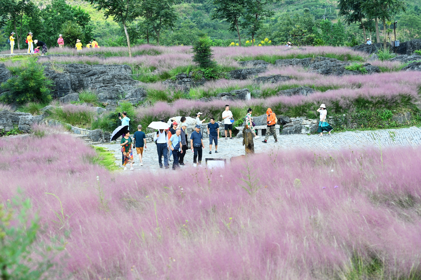 9月9日,在位于板溪镇杉树湾村的叠石花谷景区,粉黛乱子草逐渐“绽放”,吸引了来自湖南、湖北、贵州不少游客前来游玩观赏。图为游客在景区游览和打卡拍照。