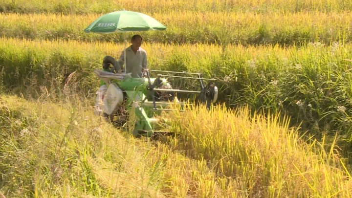 近日,记者在栗子乡太阳湾有机水稻示范种植基地看到,成片的稻穗被成熟的稻谷压弯了腰,黄灿灿的水稻随风起伏,收割机来回穿梭在稻田里忙着收割水稻,基地里一片繁忙的景象。