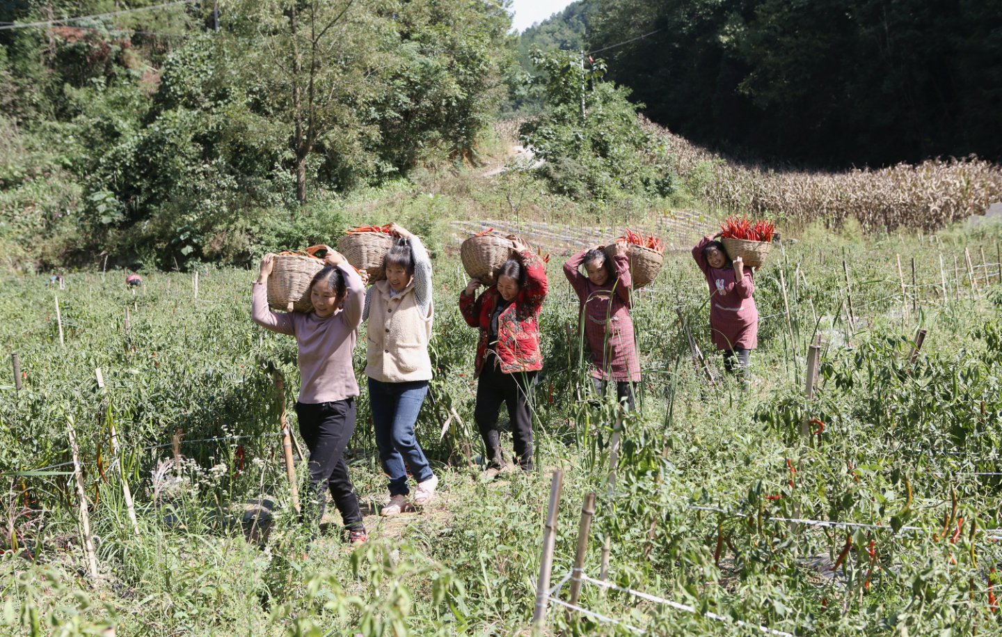 10月8日,在三溪乡白鹤村,村民们趁着天气放晴抢摘辣椒,确保减灾增收。