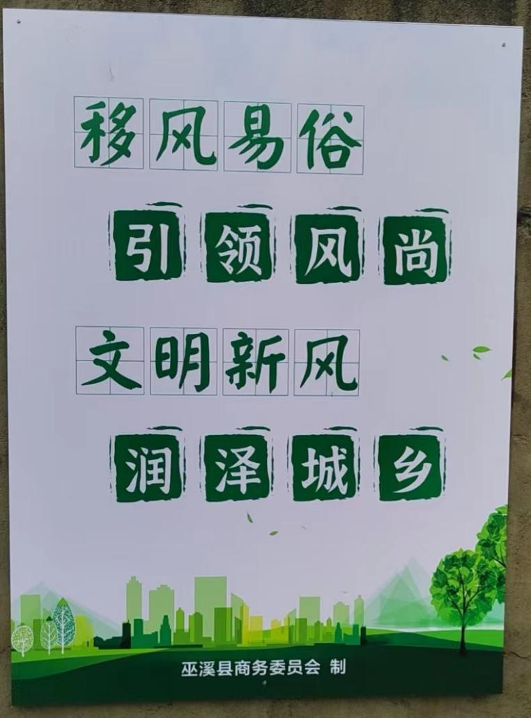 制作网络安全及国家卫生县宣传标语,利用新时代文明实践中心(所、站、点)、道德讲堂等阵地,通过院坝会、入户走访等形式,发放“森林防火倡议书”,持续深化移风易俗工作,刊播“推动移风易俗·弘扬文明新风”宣传标语,调动全民参与,文明新风满巫溪。