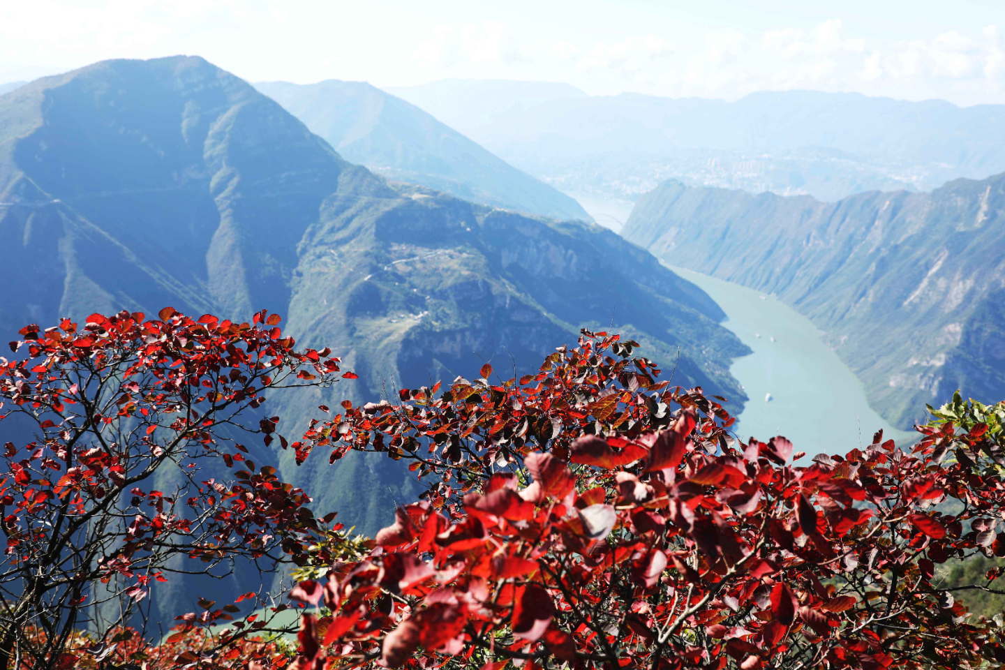 神女景区北环线金门垭观景平台,海拔近1500米,这里不仅是俯瞰长江、眺望县城的最佳点,也是红叶红得最早的地方。随着时令进入深秋,红叶将为人们奉上一场美丽的视觉盛宴。