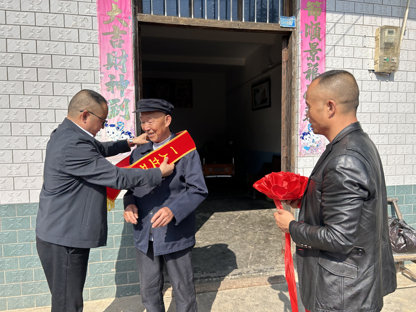10月24日,县退役军人事务局负责人、县人民武装部政工科工作人员、峰灵镇相关负责人及镇退役军人服务站工作人员一行,为谭家村荣立三等功的现役军人王友军家属送去三等功喜报和慰问金。