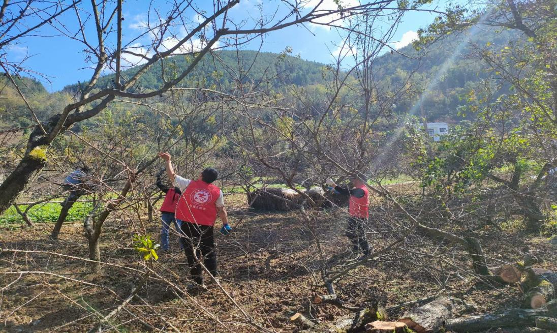 在酒泉村管护现场,志愿者和果农们正热火朝天的给连片李树拉枝、修枝、刷白、施肥.....确保果树安全越冬,保持养分充足。