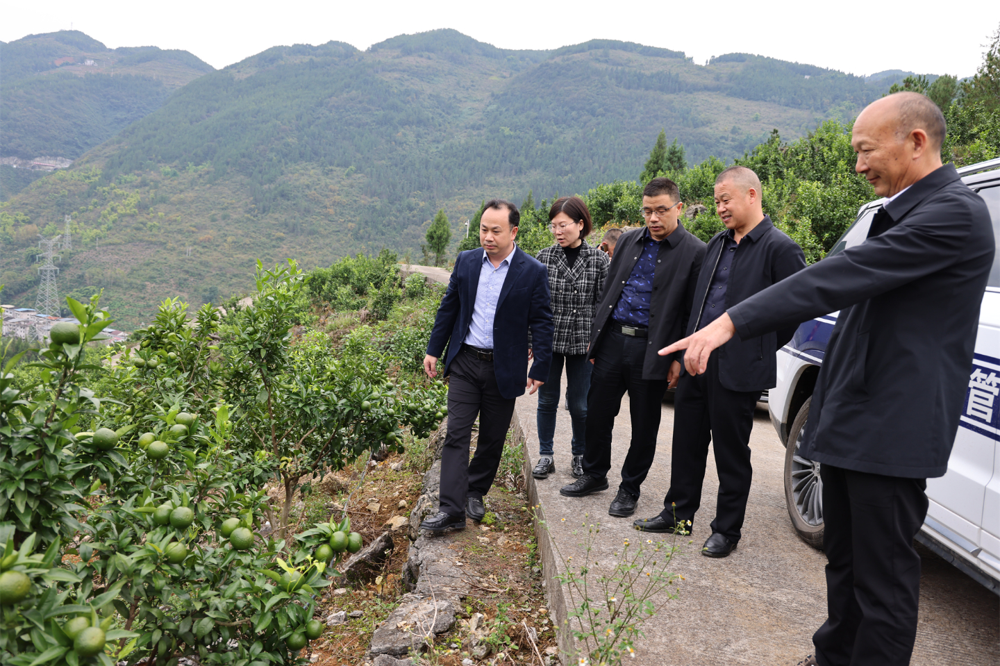 谭玉军一行深入凤凰镇石龙村沃柑智慧产业园,实地查看沃柑种植规模、技术管护、运营管理、加工营销等情况,走访了解果农需求、发展现状。