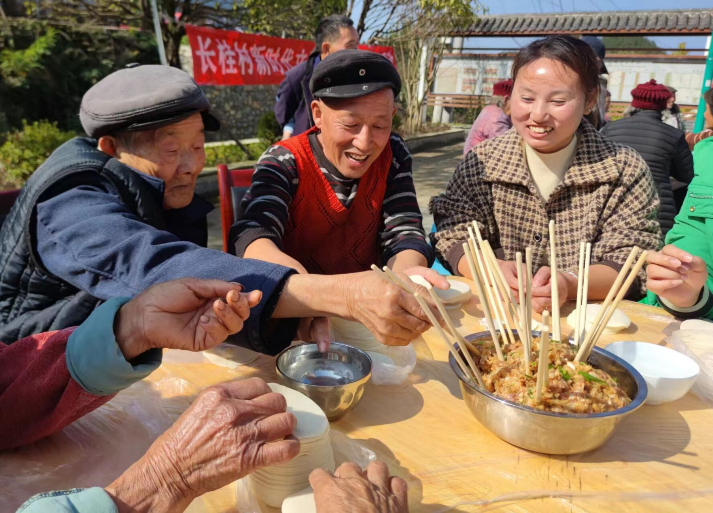 一大早,长桂村村支两委、驻村工作队和志愿者提前来到现场,准备好食材。乡亲们围成圈,大家分工合作,边包饺子、边话家长,不一会儿功夫,一个个饺子就包好了,大家吃着自己包的饺子,有说有笑,脸上洋溢着幸福的笑容。