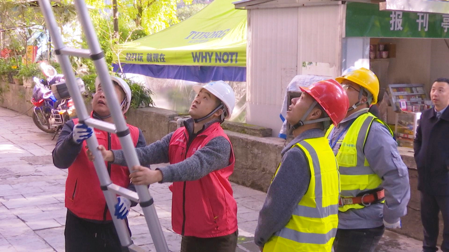 在人民社区宁河街漫滩路,中国移动巫溪分公司中移铁通工作人员穿戴好工作服,佩戴好设备,在施工演示区域摆放好施工牌,警示锥,演示了管线整治流程。