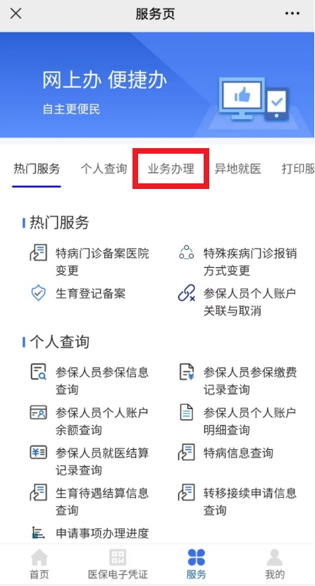 点击页面上的【业务办理】