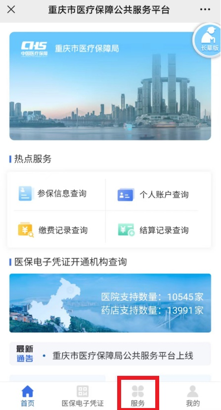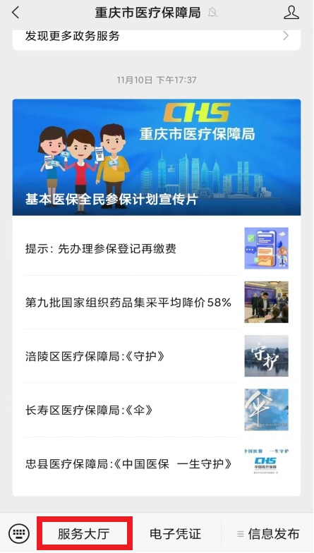 微信搜索“重庆市医疗保障局”公众号,点击页面上的【服务大厅】