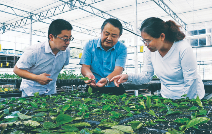 安广池(右)在苹果桃基地内指导施肥、修枝等工作