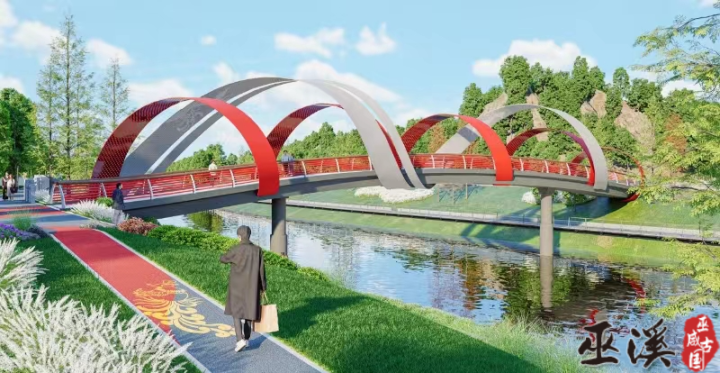 据介绍,1号景观桥取名为飞虹桥,长约65米,宽4米,桥体立面上呈曲线形态,桥上则采用红白双色飘带作为主体装饰,喻意古代文化与现代文明在此碰撞与交融,光影交错。