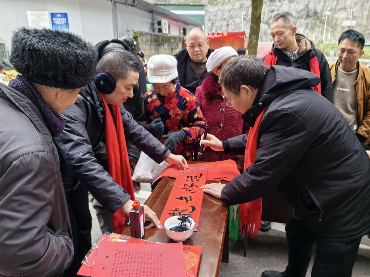 活动现场,村民簇拥在书案前,挑选着自己心仪的对联词,本地书法爱好者们挥毫泼墨、凝神动笔,一时间红纸翻飞墨香四溢,一幅幅充满吉祥祝福的手写春联呈现在人们眼前。一幅幅散发着清新墨香的大红春联晾成一排,瞬间“年味儿”扑面而来,迎得居民们拍手叫好、连连称赞。