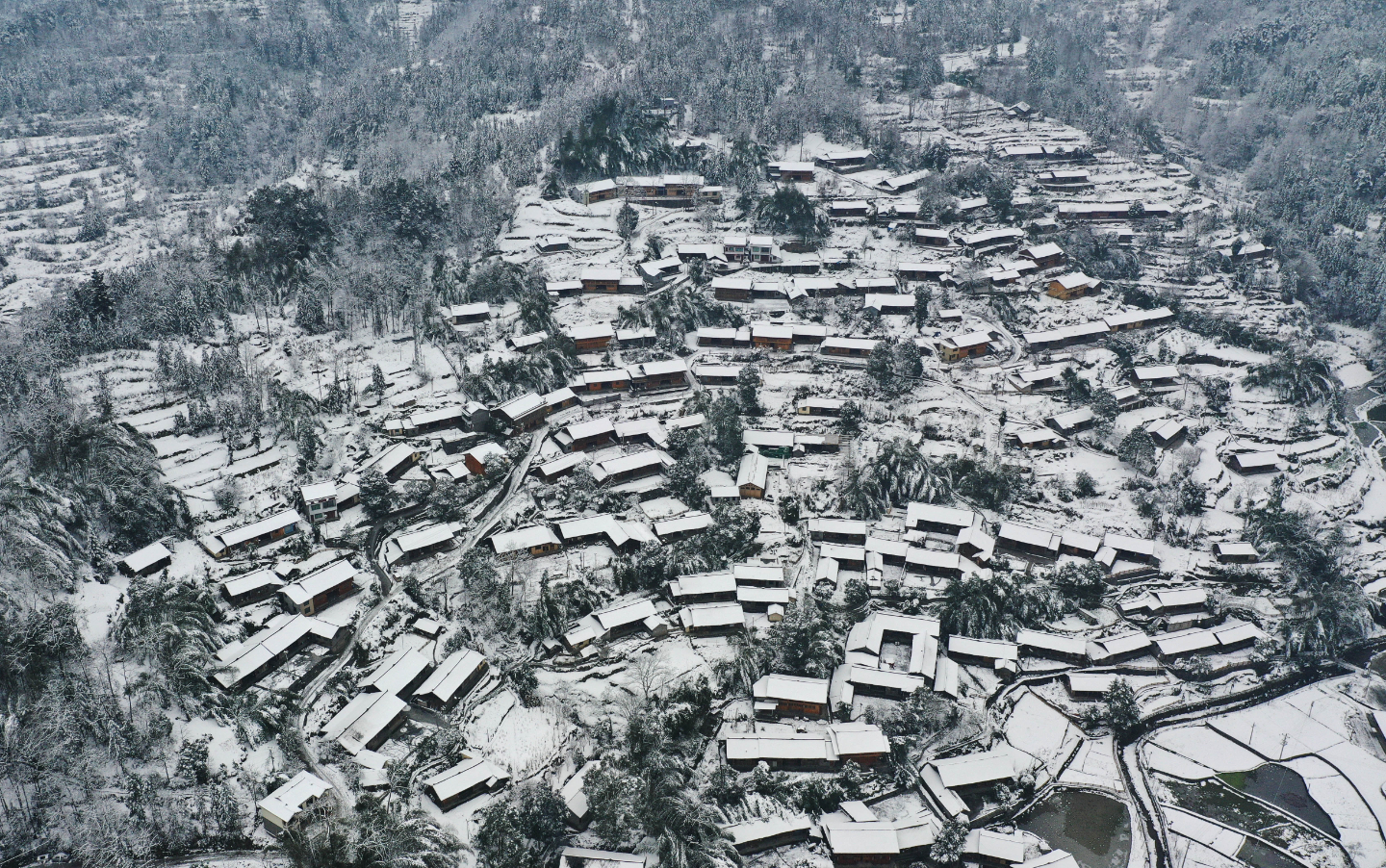 翠翠秀山客户端讯 1月21日夜间到22日白天,我县普降大到暴雪,积雪最深近30厘米,一夜之间,大地、山川、村寨披上了一件洁白的衣裳,呈现出一派北国风光。龙凤坝镇大寨村白雪皑皑、银装素裹,依山而建的民居在白雪掩映下分外美丽。高空俯瞰,一幢幢民居犹如一串串跳动的音符,奏响冬日奋进曲。