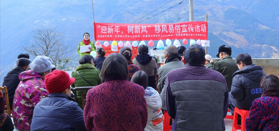 近日,在县民政局的领导下,在大河乡人民政府、大河乡民主村村支两委的大力支持下,巫溪县青穗社会工作服务中心在民主村举办“迎新年,树新风”移风易俗主题宣传活动。
