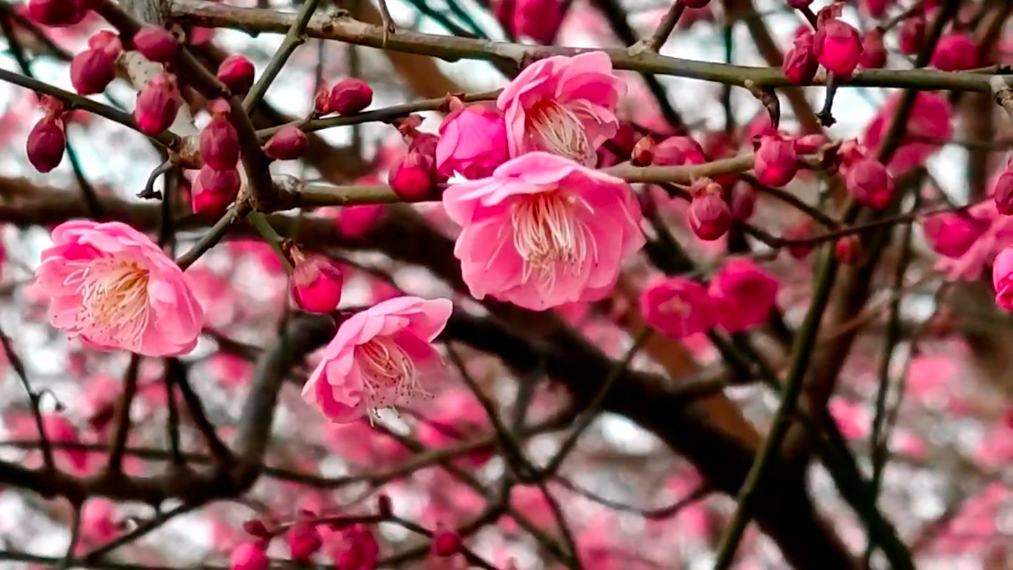 李萌:“梅花开了,有白色的、红色的,非常美丽,在公园里散步,很惬意。”