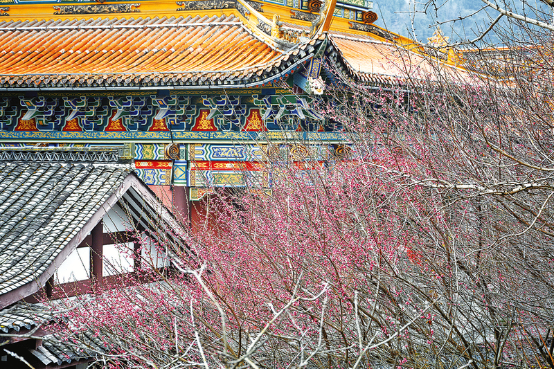 除此之外,朵朵红梅在寒风中摇曳生姿,有的含苞待放,有的花团锦簇,映衬着亭台楼阁,与飞檐翘角相映成趣,成了冬日里一抹靓丽的色彩。