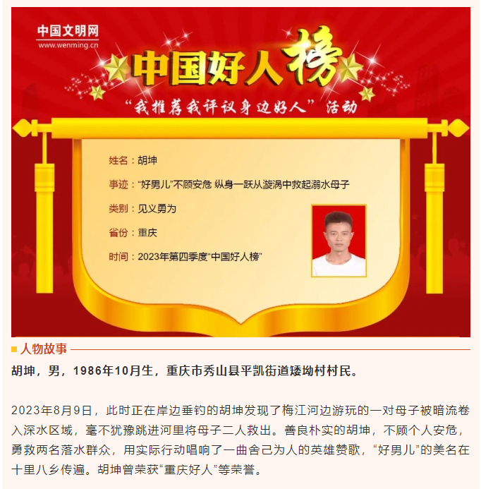 翠翠秀山客户端讯 日前,2023年第四季度“中国好人榜”正式发布,全国共有152人(组)入选。我县胡坤获评“见义勇为好人”。