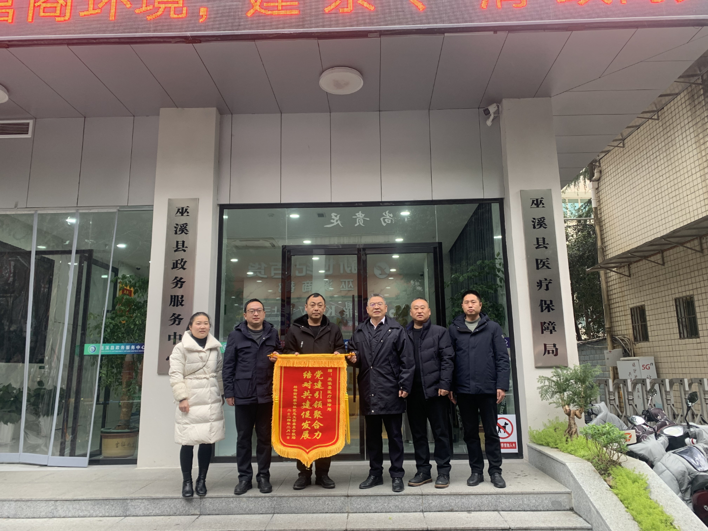 2月4日,柏杨街道新华社区党支书记杨俊一行来到县医保局,将写有“党建引领聚合力 结对共建促发展”的锦旗,送到县医保局党支部,对县医保局在社区工作中给予大力支持表示感谢。这面锦旗是新华社区党总支对县医保局支部党建共建工作的认可与赞扬。