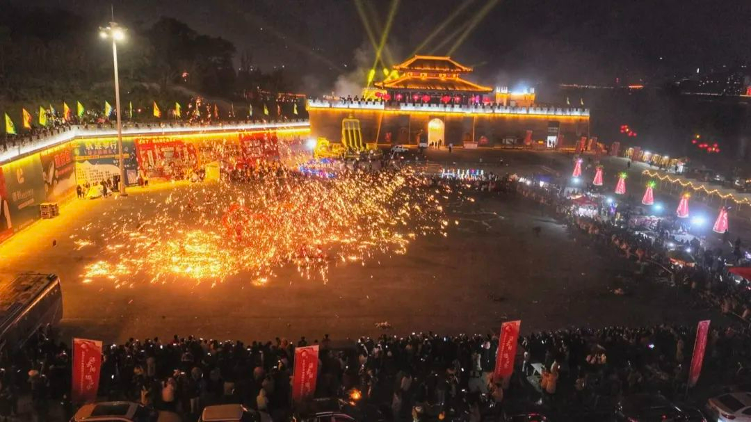 张飞庙景区内打铁花的现场人山人海