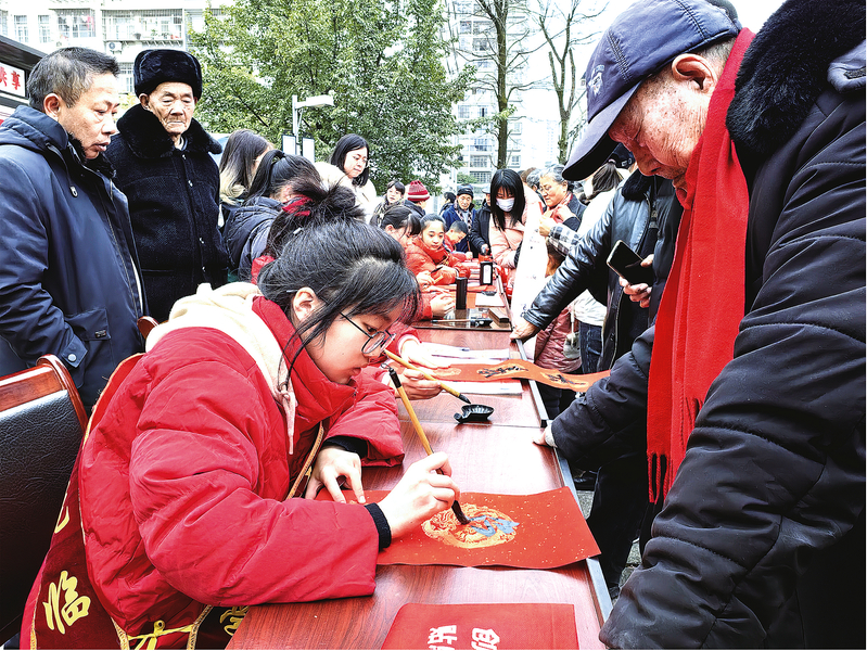 1月31日,区妇联联合云枫街道永先社区在云枫北广场开展“把爱带回家 温情暖人心”新春送祝福活动。汉丰一校的小小书法爱好者们将对新春的祝福和对美好生活的期盼倾注于一笔一划、一撇一捺间,饱含祝福的话语跃然纸上,吸引居民纷纷驻足围观。