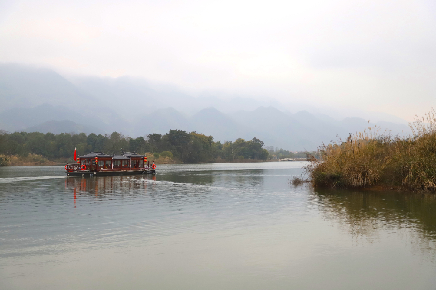 2月26日,游客在水雾微雨中乘坐画舫,游览大足龙水湖,饱览湖光山色,只见水天交接,犹如一幅经典水墨画。