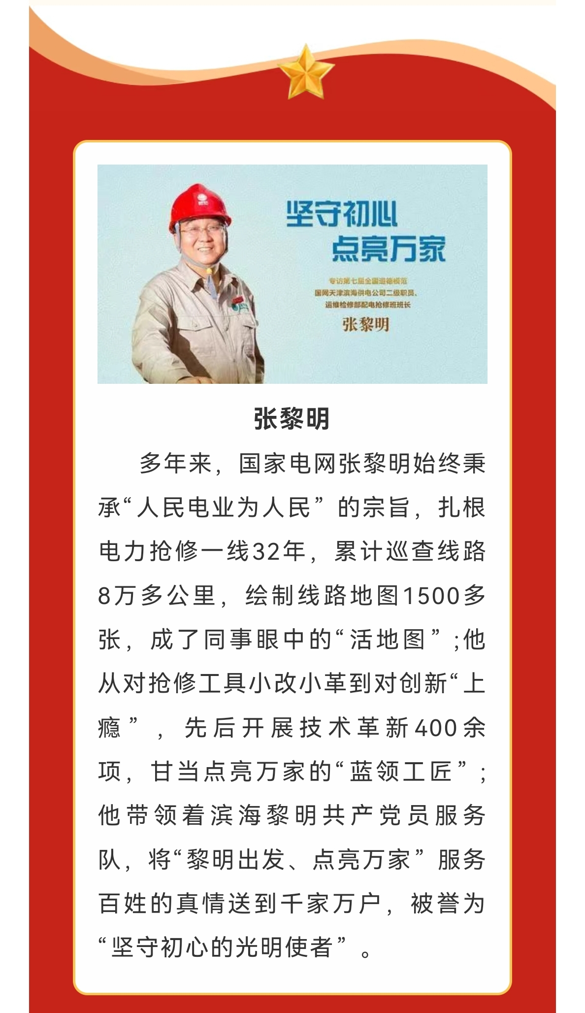 为进一步开展“强国复兴有我”群众性主题宣传教育活动,营造弘扬正气、树立标杆的浓厚氛围,激励和引导市民群众学习榜样的力量,积极参与到国家的建设和发展中去,为强国复兴贡献更多更大的力量。本刊将陆续推出“强国复兴有我·网上展示”专栏。本期推出《坚守初心点亮万家一一张黎明》,以飨读者。